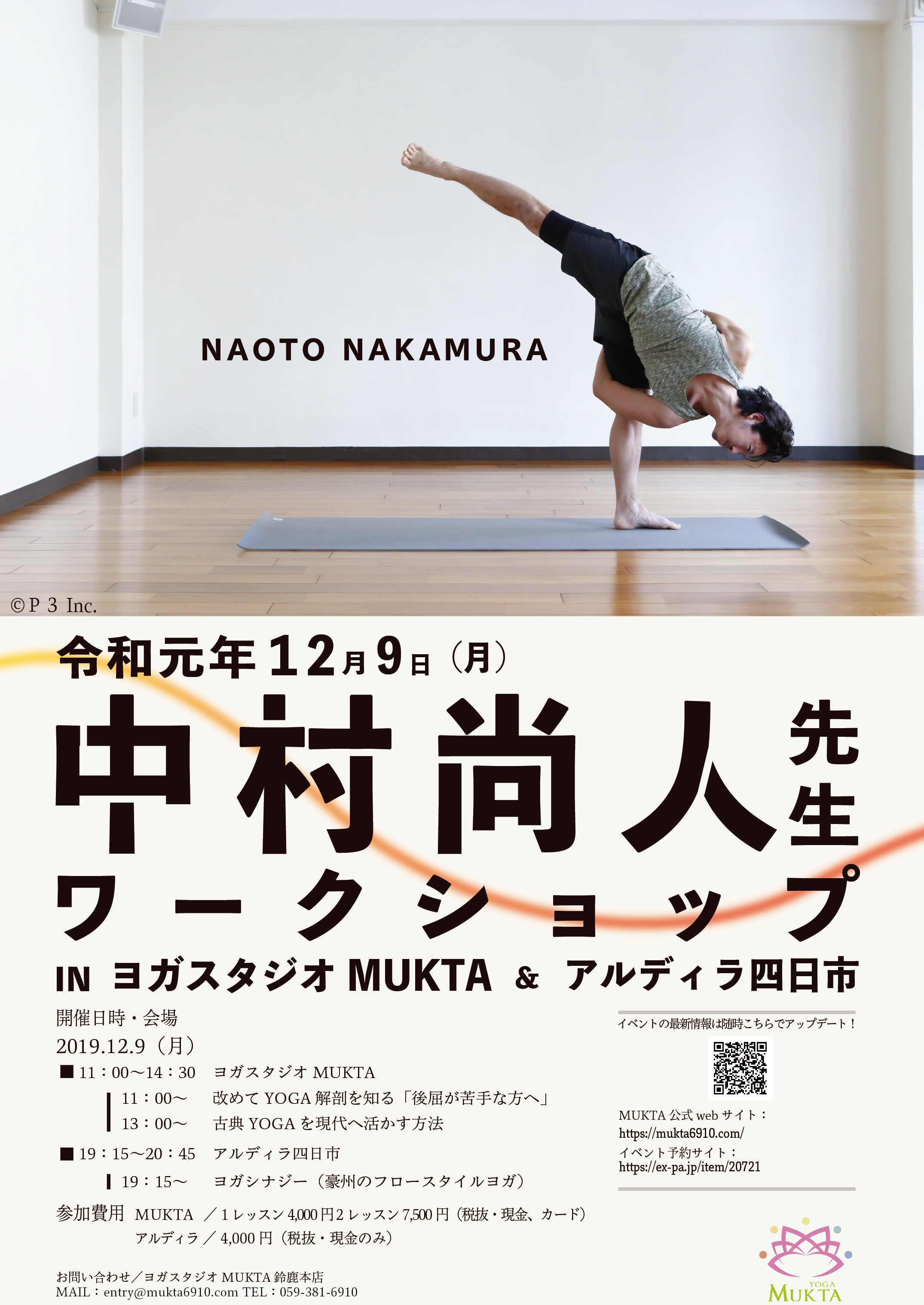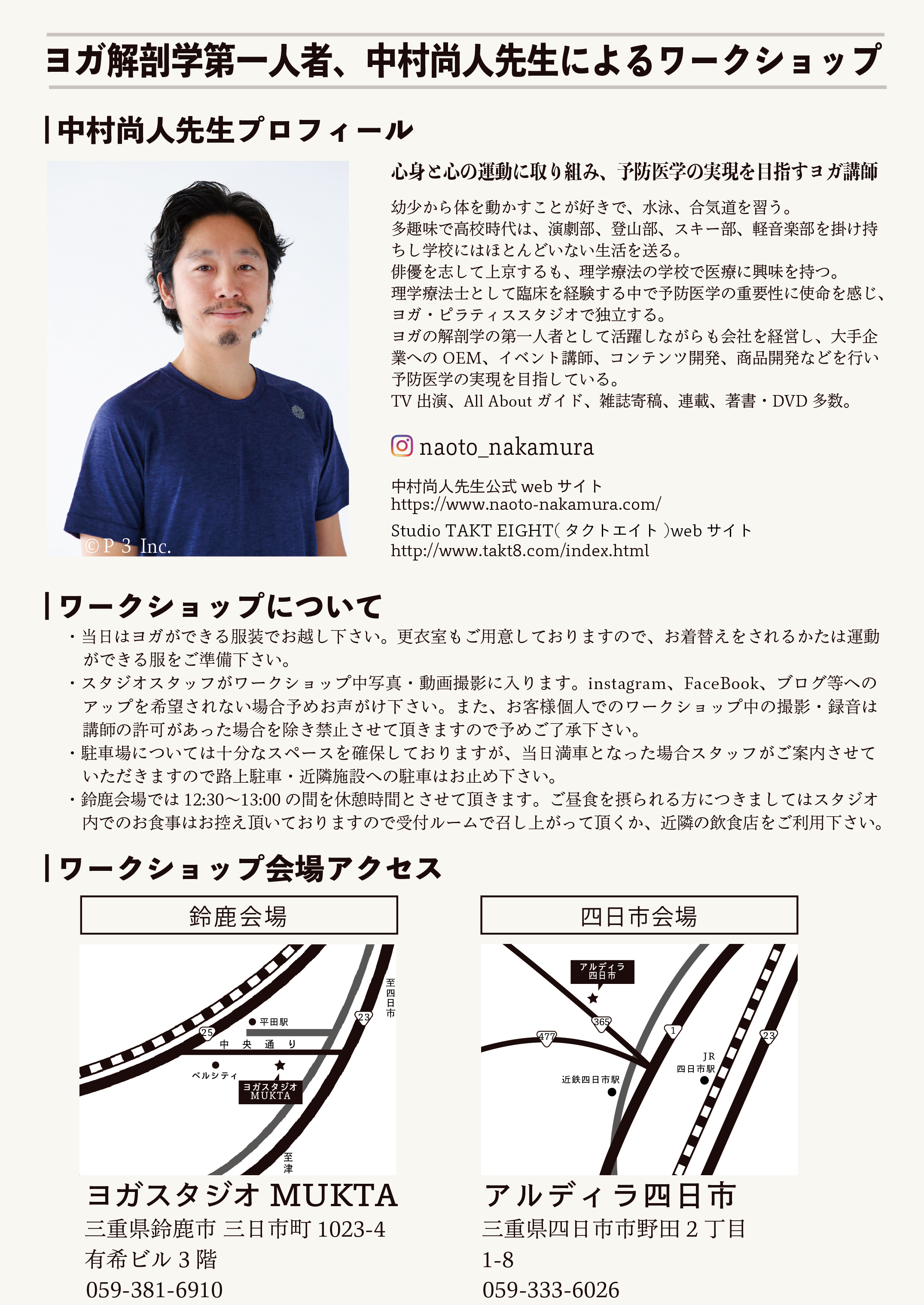 鈴鹿会場では11:00〜14:30(2レッスン)「ヨガスタジオMUKUTA」(三重県鈴鹿市三日市町1023-4有希ビル3F)にて、